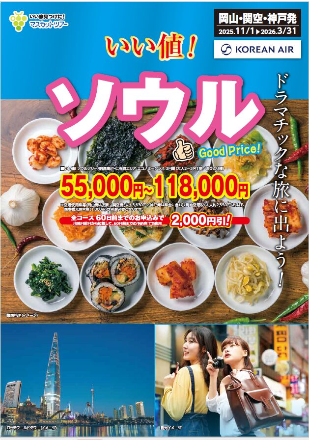 「神戸発着・大韓航空で行くソウル3日間」のお申込みを受付中です。