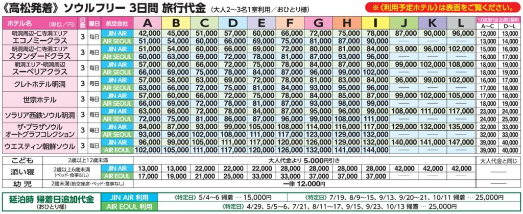 ※燃油サーチャージは旅行代金に含みます。現地空港緒税 大人24,000ウォン(約2,600円)こども17,000ウォン(約1,810円)、高松空港旅客取扱施設利用料および旅客保安サービス料 大人790円(こども520円)、および、国際観光旅客税(1,000円/大人・こども同額)は別途申し受けます。《幼児は不要です》
