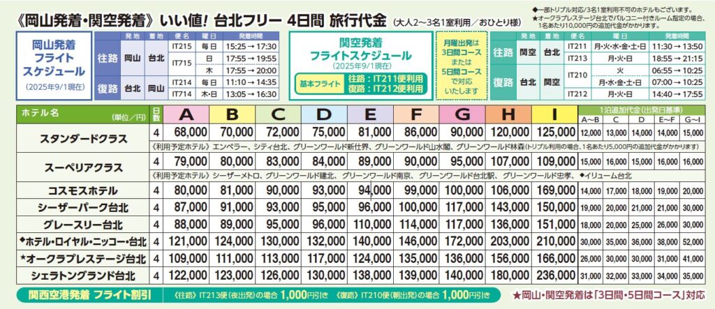 ※燃油サーチャージ不要(2025年9月1日現在)。空港諸税(関空発・大人3,630円/岡山発は不要)、現地空港税(約2,400円)および、国際観光旅客税(1,000円)が別途必要となります