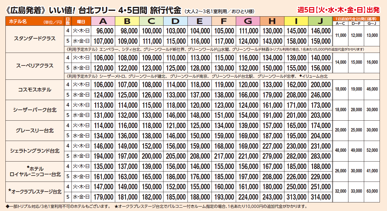 台北フリー4・5日間/スタンダートクラス 96,000円~146,000円 (大人2~3名1室利用/ おひとり様)